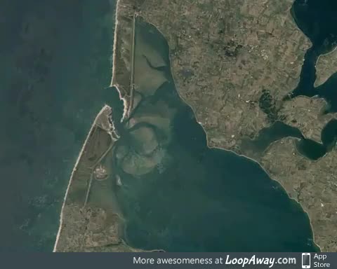 Satellite timelapse of sea currents pushing underwater sandbanks around in Thyborøn kan*l,