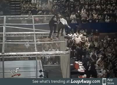 1998 When Undertaker threw Mankind off Hell in a Cell & plummeted 18 ft through an announc