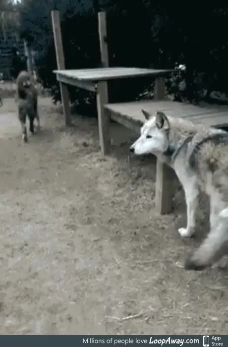 A fully grown wolf standing up against a person