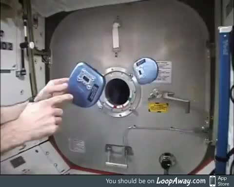 The difference in stability of a CD player that is turned off or on in microgravity