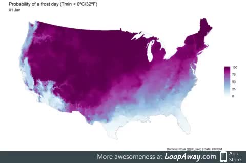 Frost day probability (minimum temperature < 0ºC/32ºF) through the year in the Contiguous United States [OC]
